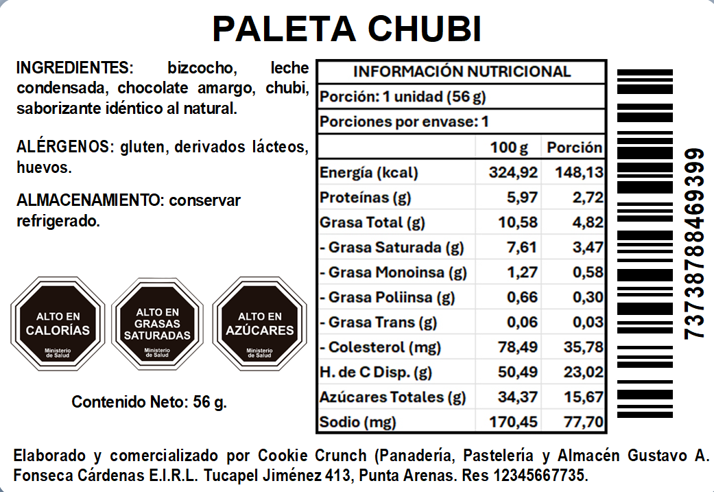 - Chubi: migas de bizcocho de vainilla con leche condensada, con chubis en su interior, bañada con chocolate semi amargo.
