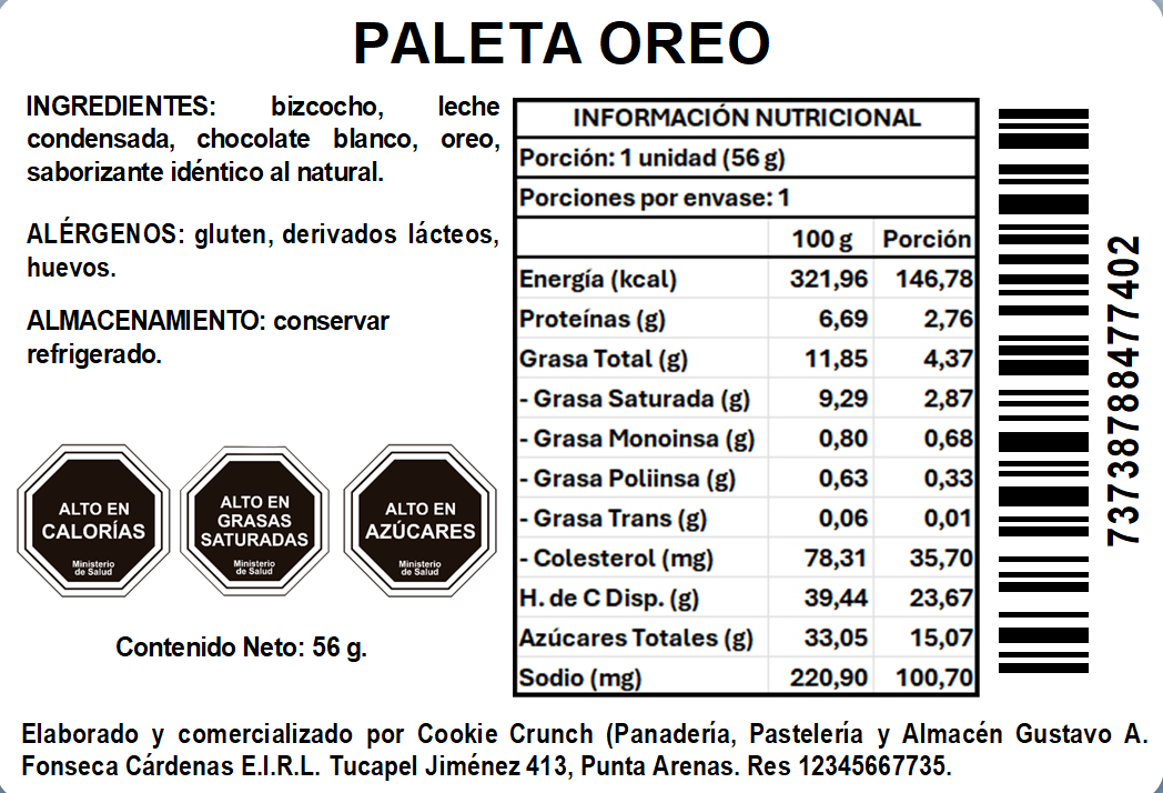 - Oreo: migas de bizcocho de vainilla con leche condensada, con trozos de óreo en su interior, bañada con chocolate blanco.
